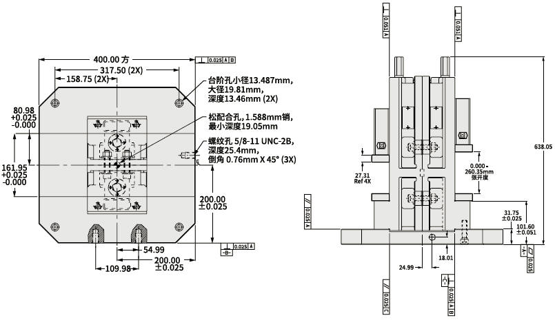 38V2T400 即 3800V鉗背對背安裝在400mm基礎(chǔ)板上(無加高墊塊)