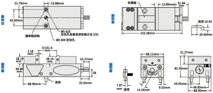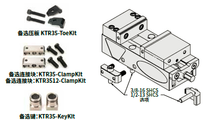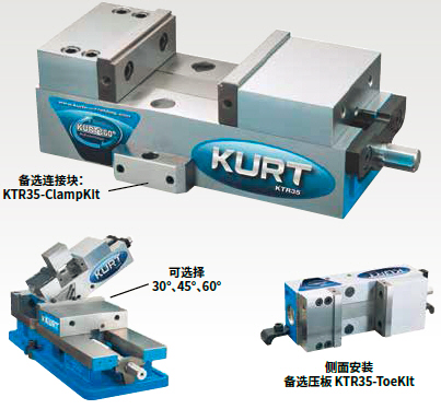 多功能鉗型號:KTR35該多功能鉗可以用在任何小臺面的機床上,加上絲杠的外六角總 體長度只有257.175mm和9.07kg重量。鉗口寬度88.138mm,張開 度96.774mm,使用鉗口的臺階時張開度為105.664mm。帶有防 屑板。可以通過鉗身上的孔或者單獨購買的壓板固定虎鉗。各個 側(cè)面均磨削加工,方便各種方向使用。兩個端面有四個適于壓板 的空腔。當(dāng)另外使用一臺母鉗時該鉗可以作為正弦鉗使用,依靠 鉗身上的自身定位孔實現(xiàn)30°、45°和60°的角度加工(注:鉗身上加 工這三個角度是客戶選項,請聯(lián)系我們報價)。當(dāng)使用正弦鉗功能 時,只需要把鉗身側(cè)面的磁力貼片揭下,并使用定位銷即可。特點: